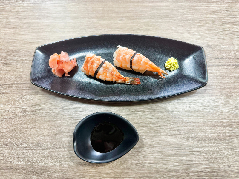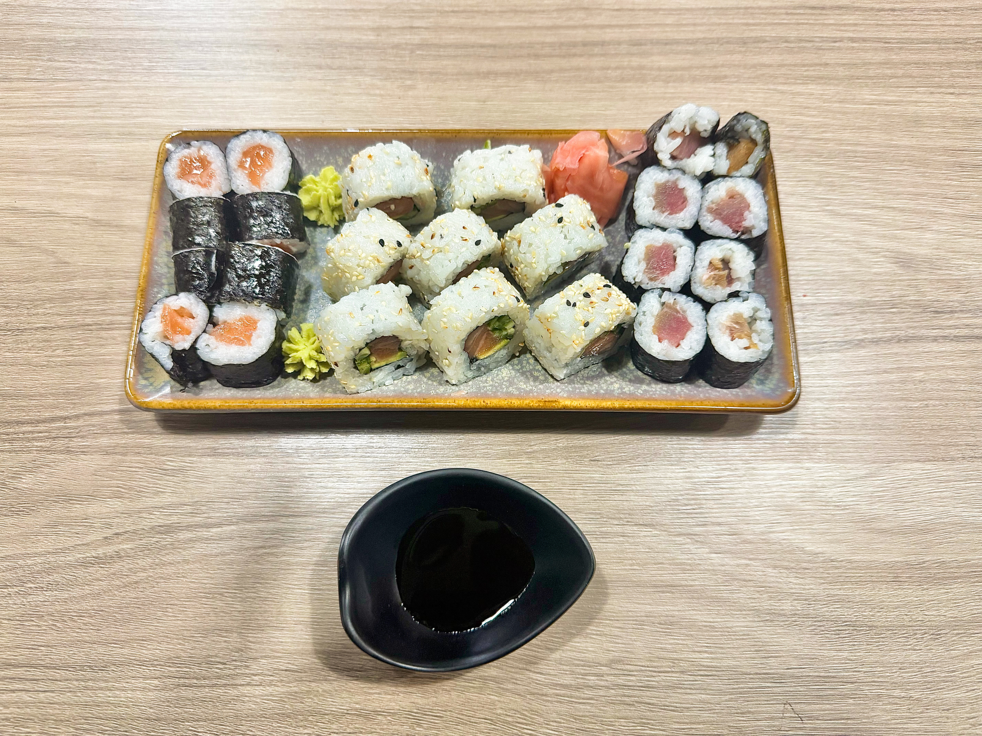 2ks nigiri losos, 2ks nikiri úhoř, 2ks krevety, 2ks tuňák, 4ks cali losos, 4ks cali úhoř, 6ks cali avokádo (2,4)