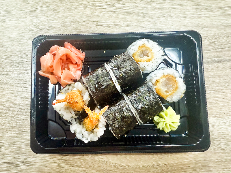 Tom roll 10ks, tripple s roll 10ks, nigiri losos 2ks, nigiri tuňák 2ks, nigiri krevety 2ks, nigiri úhoř 2ks, maki krevety 8ks, maki avokádo 8ks, california losos 8ks