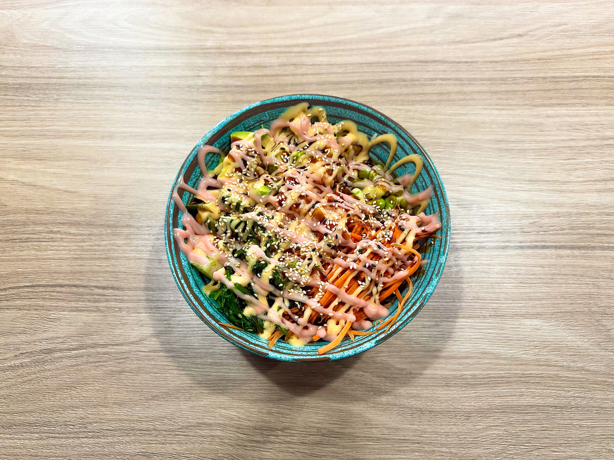 Tuňák, edamame, avokádo, okurka, ředkev, mrkev, sezam, teriyaki, omáčka, rýže (4,11)